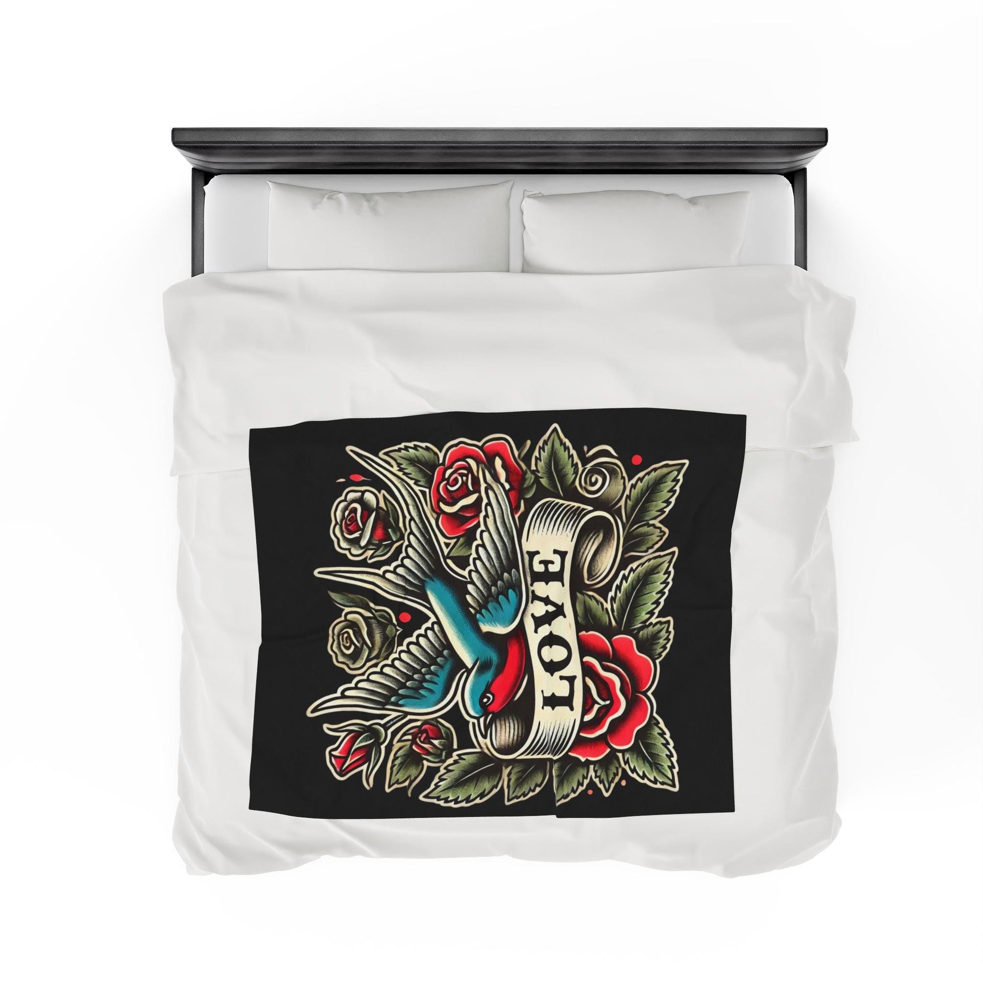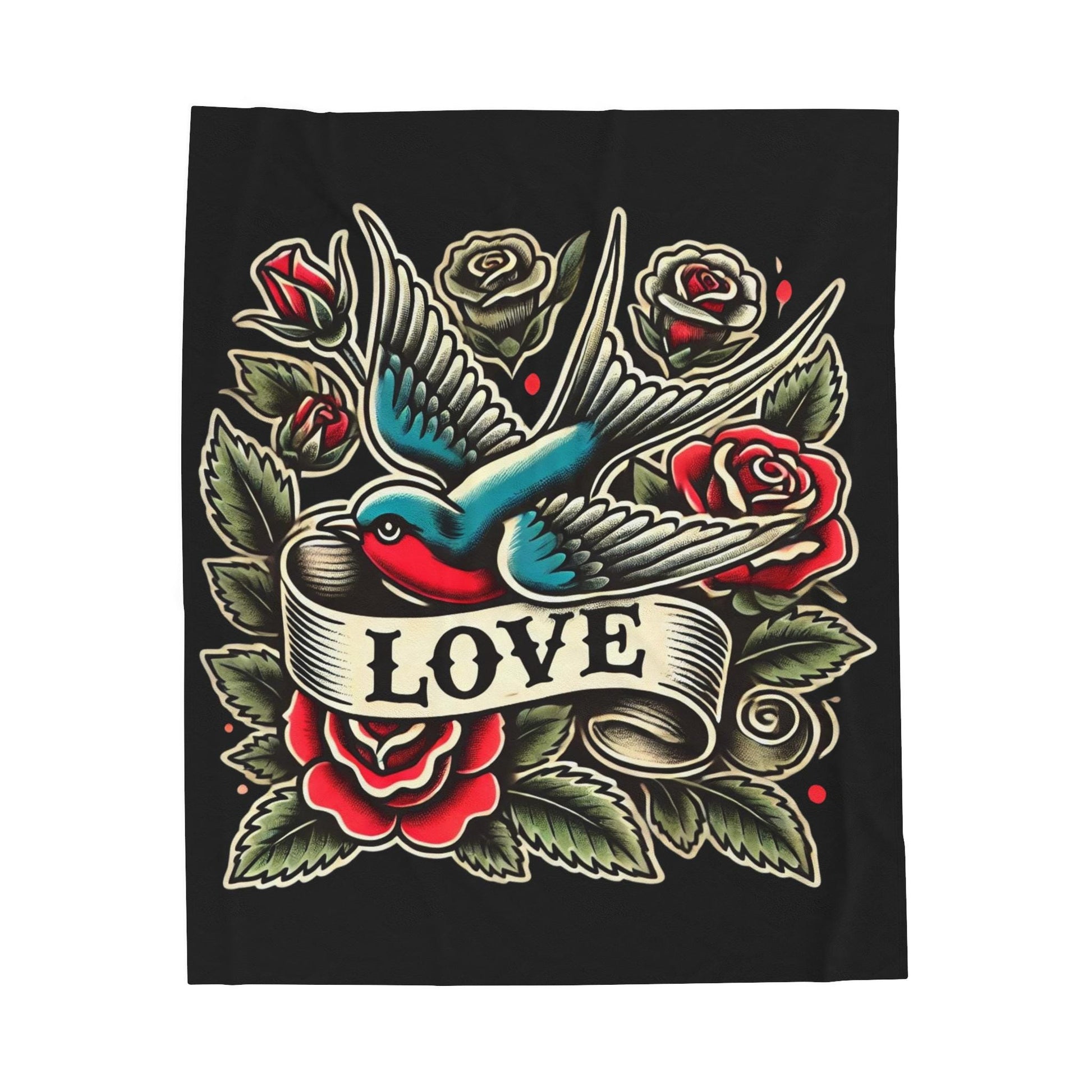 Bird Plush Blanket - Vintage Tattoo LOVE Design, Fleece Throw, Housewarming Gift, Nature Theme, Warm Bedding, Tattoo Lover