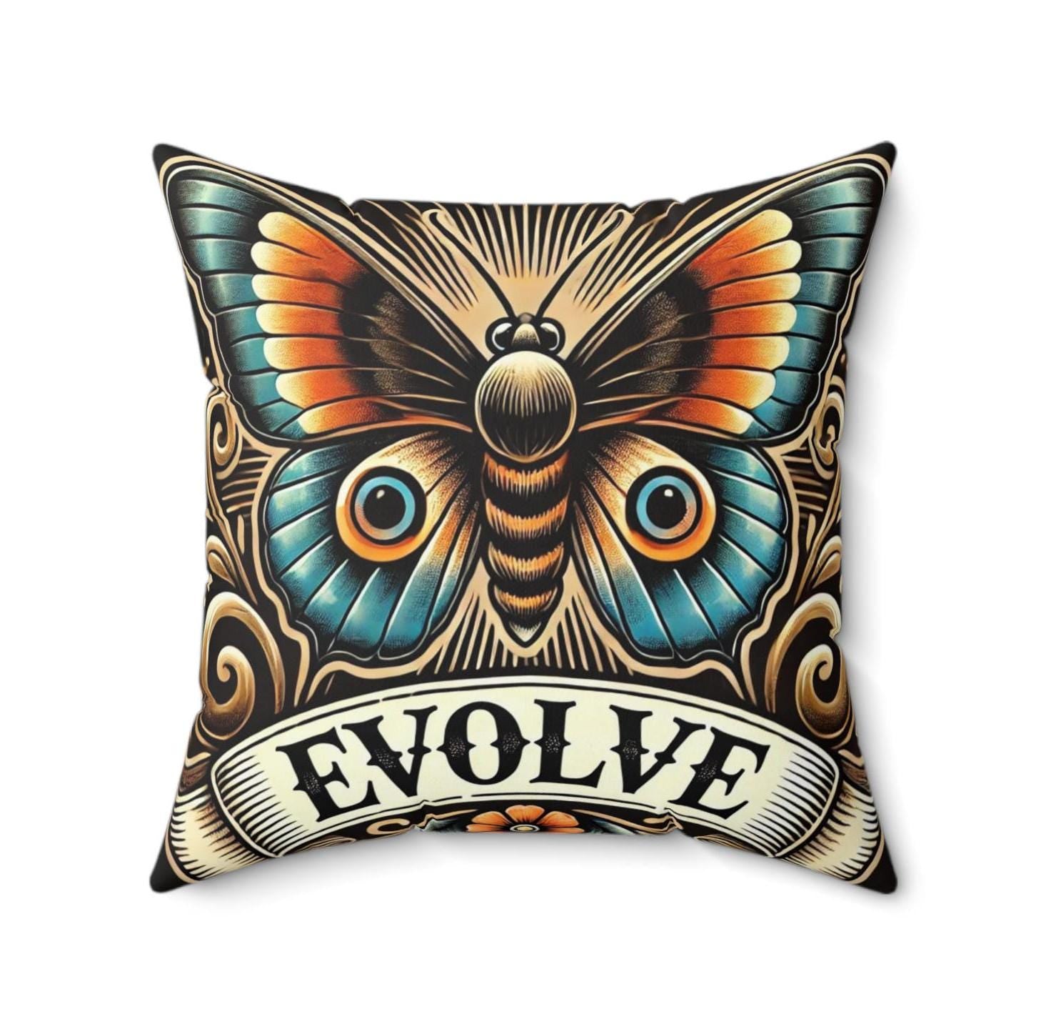 Vintage "EVOLVE" butterfly tattoo design plush throw pillow perfect for adding a touch of retro charm to your home decor. Ideal as a housewarming gift, this square pillow exudes a cool vibe. Relevant for those who appreciate vintage aesthetics and value art in their living spaces. Product features: - 100% Spun polyester material for shape retention and no wrinkles - Beige zipper with metal head for a stylish look - Includes a polyester pillow insert for extra volume - Double sided print for versatility - Concealed zipper for a seamless look Care instructions: - Remove the pillow cover. Pre-treat the stains with soft cloth or bristle brush that had been soaked in warm soapy water. Machine wash, max 40°C (104°F), normal cycle. Do not bleach, tumble dry on low, do not dry-clean. Iron, steam, or dry low heat only. Fluff to reshape when assembling it back together.