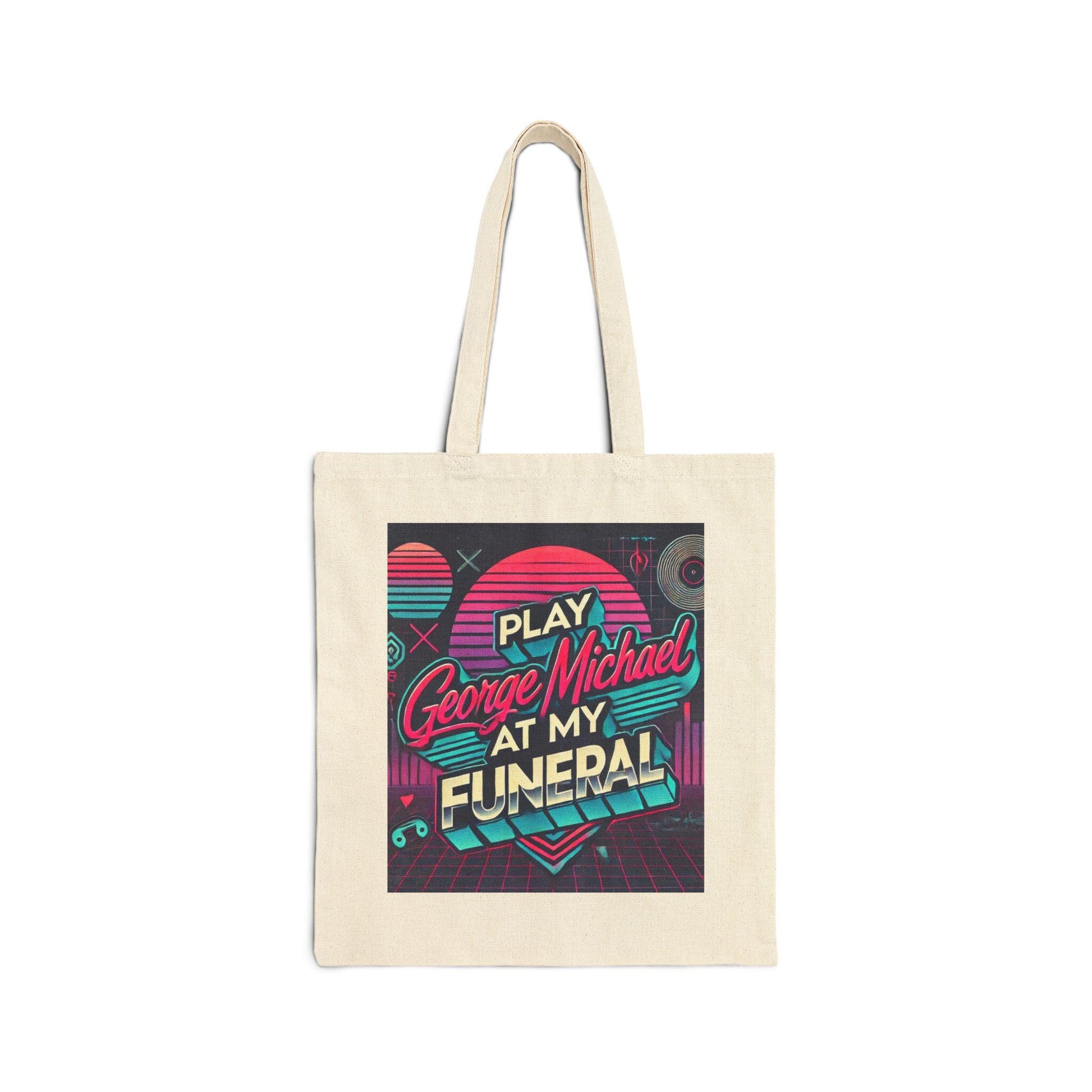 This durable and eco-friendly canvas tote bag featuring a vintage 1980s neon Play George Michael At My Funeral design if perfect for queer book lovers, music enthusiasts, and can be also used as a reusable grocery bag. A great gift for those in the LGBT community and a practical accessory for market shopping or daily use.