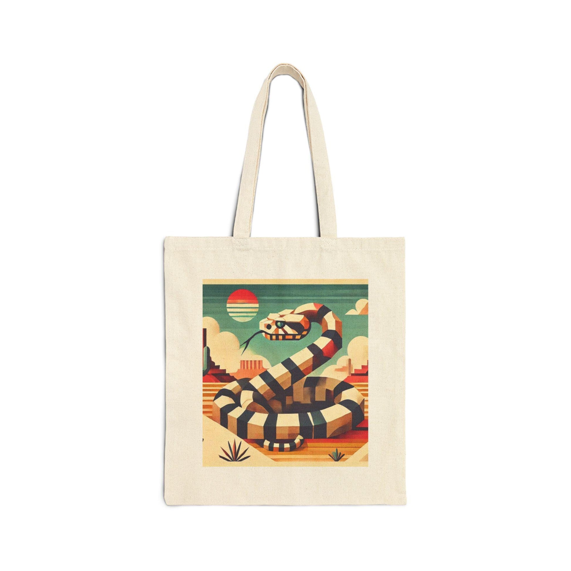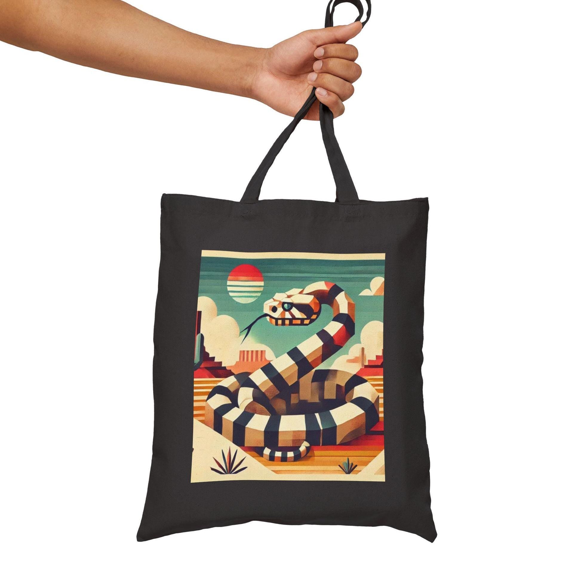 Durable and eco-friendly canvas tote bag featuring a modern cubist Southwestern rattlesnake design, perfect for book lovers, reptile enthusiasts, and as a reusable grocery bag. This bag is a great and a practical accessory for market shopping or daily use.