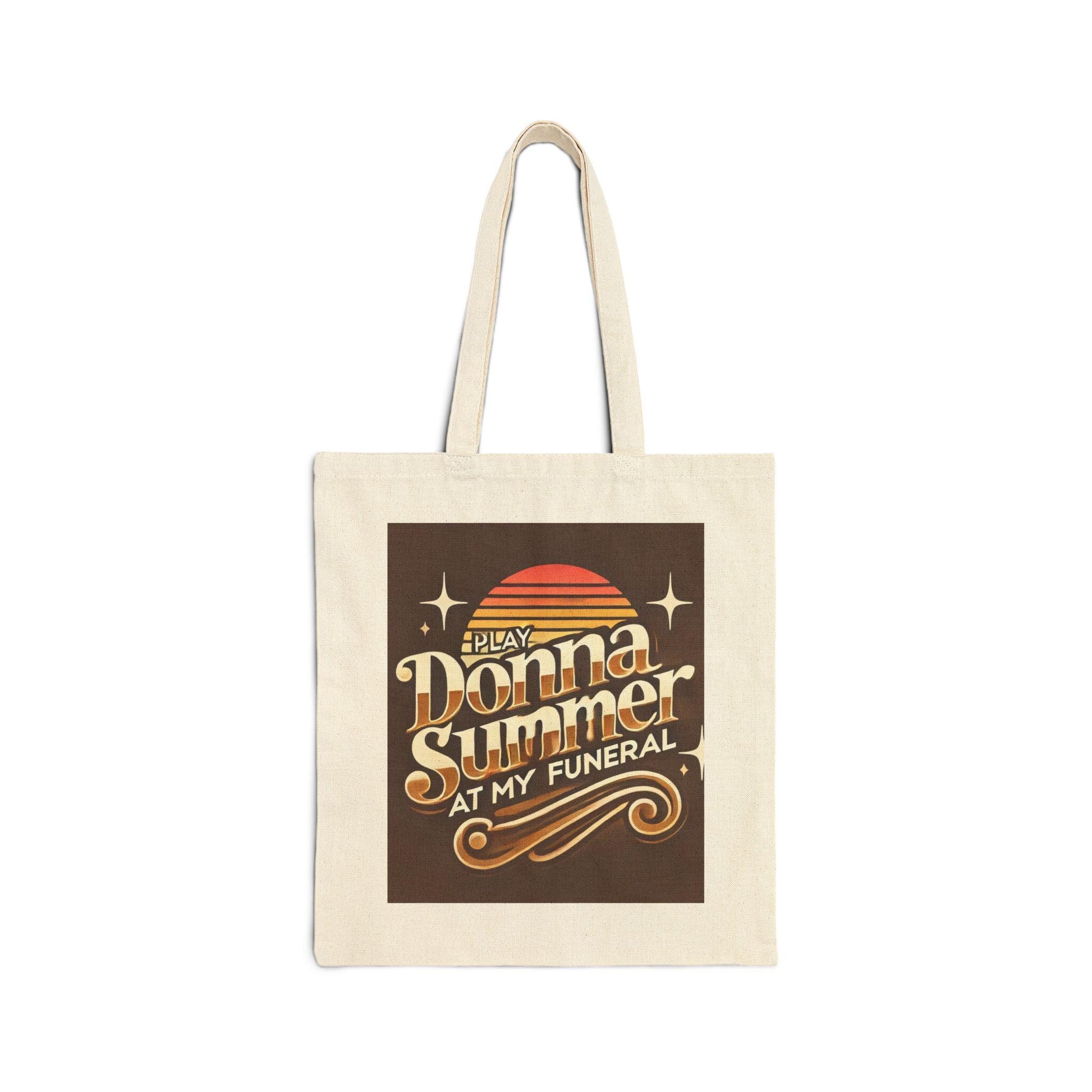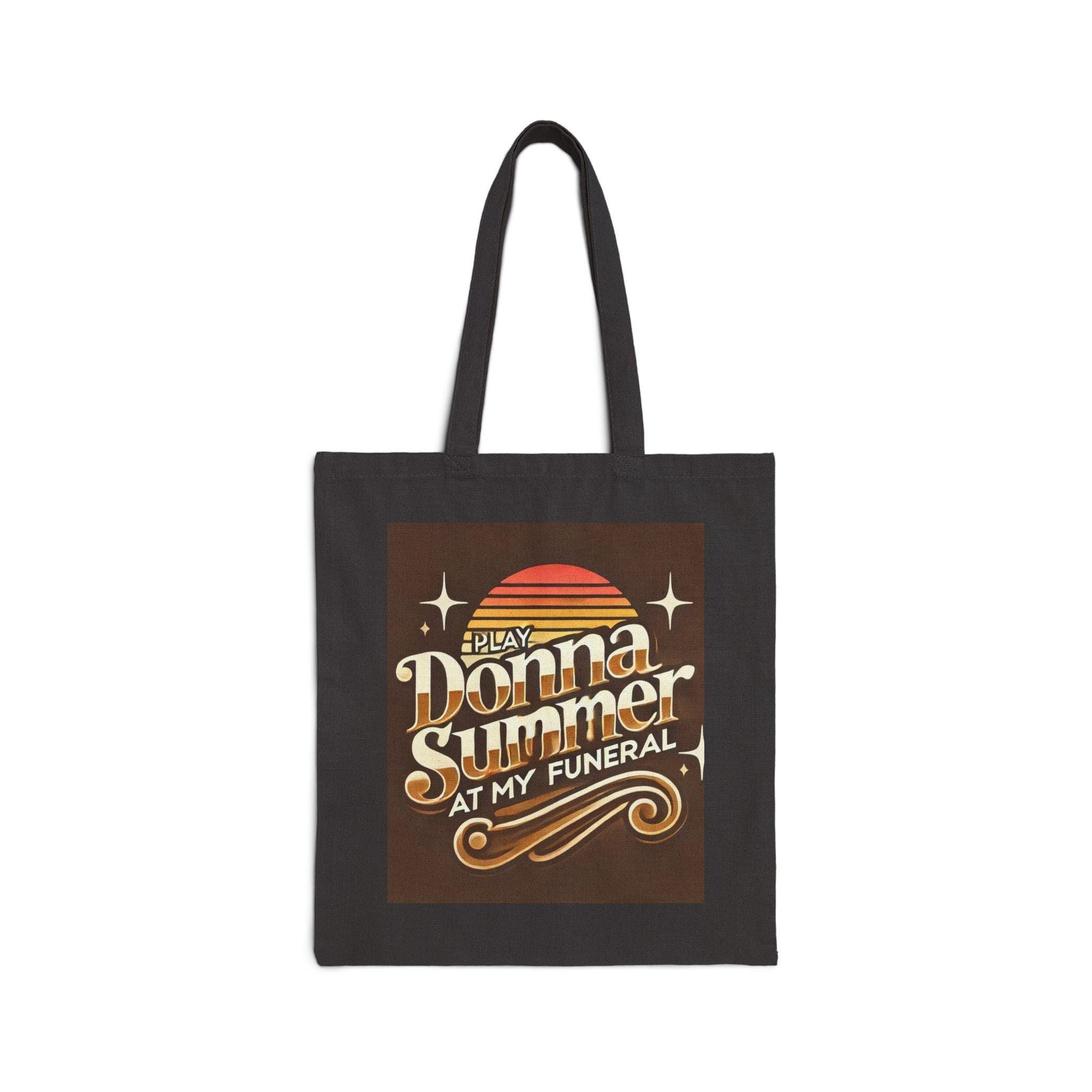 Durable and eco-friendly canvas tote bag featuring an original vintage 1970s Play Donna Summer At My Funeral design, perfect for queer book lovers, disco enthusiasts, and as a reusable grocery bag. This bag is a great gift for the LGBT community and a practical accessory for market shopping or daily use.