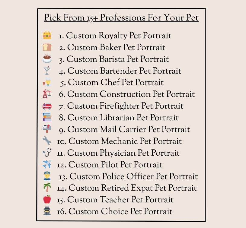 ✔️ A custom canvas portrait featuring your pet in the profession of your choice