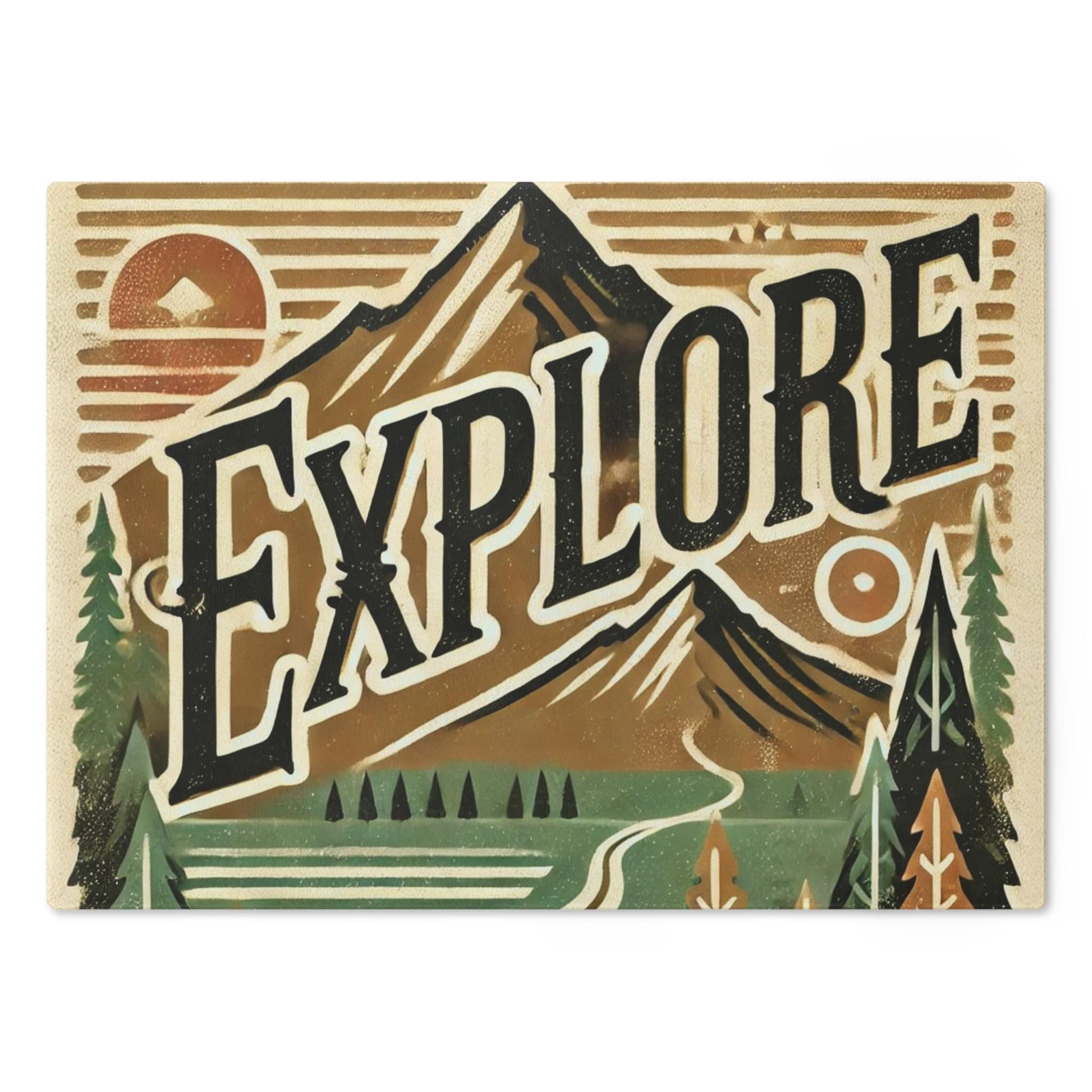An EXPLORE design cutting board for nature lovers and foodies. Perfect for adding a touch of the great outdoors to your kitchen decor or as a thoughtful housewarming gift. Suitable for those who enjoy exploring nature and outdoor adventures. Relevant for housewarmings, birthdays, and holidays.