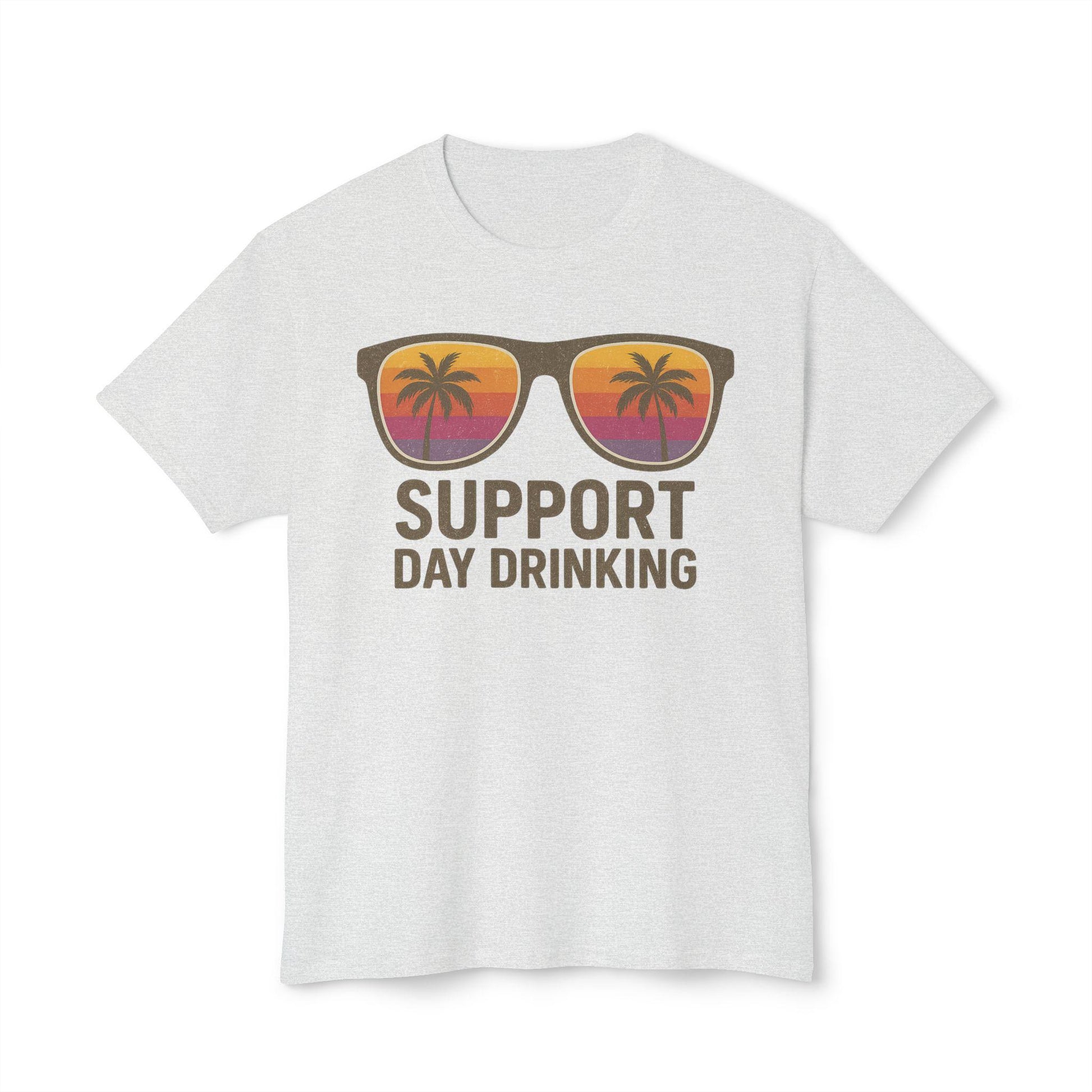 A retro-style Support Day Drinking t-shirt perfect for fun summer vibes, whether at a pool party or for casual beachwear. Ideal for those looking for a gift for friends or an essential vacation accessory. This tee is a classic fit made with light fabric, perfect for all-day comfort.
