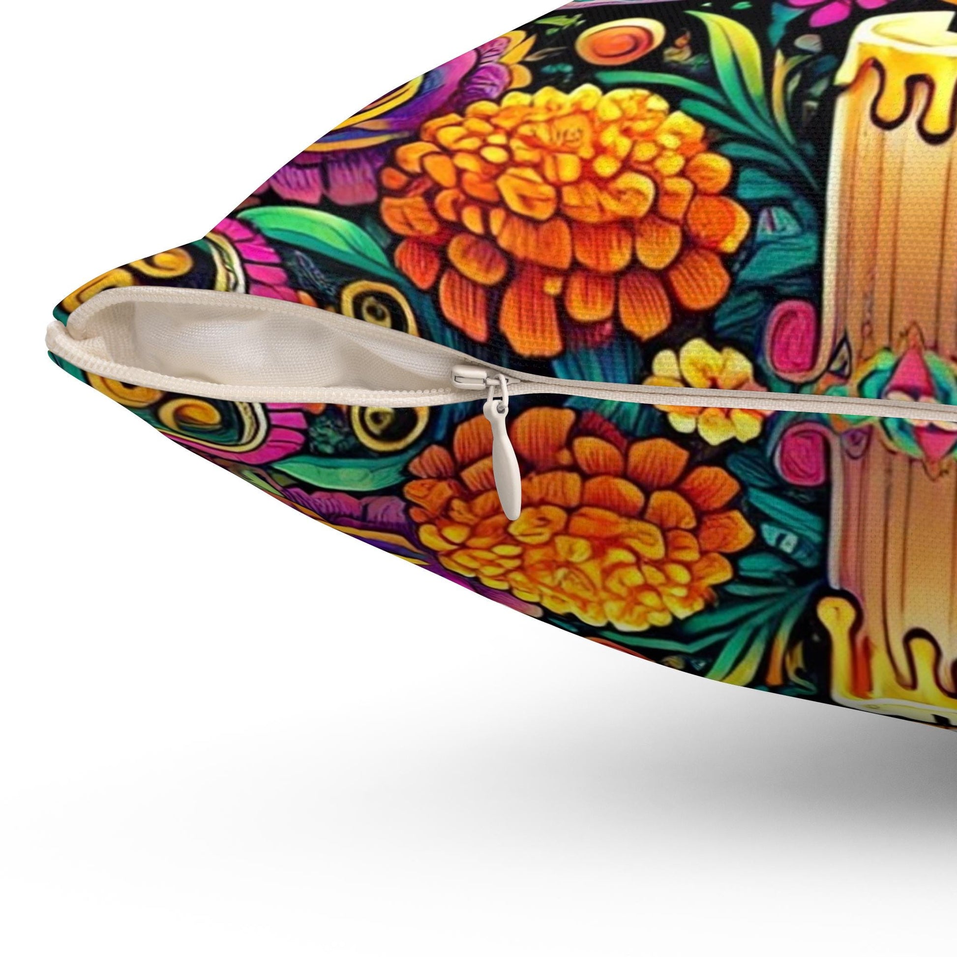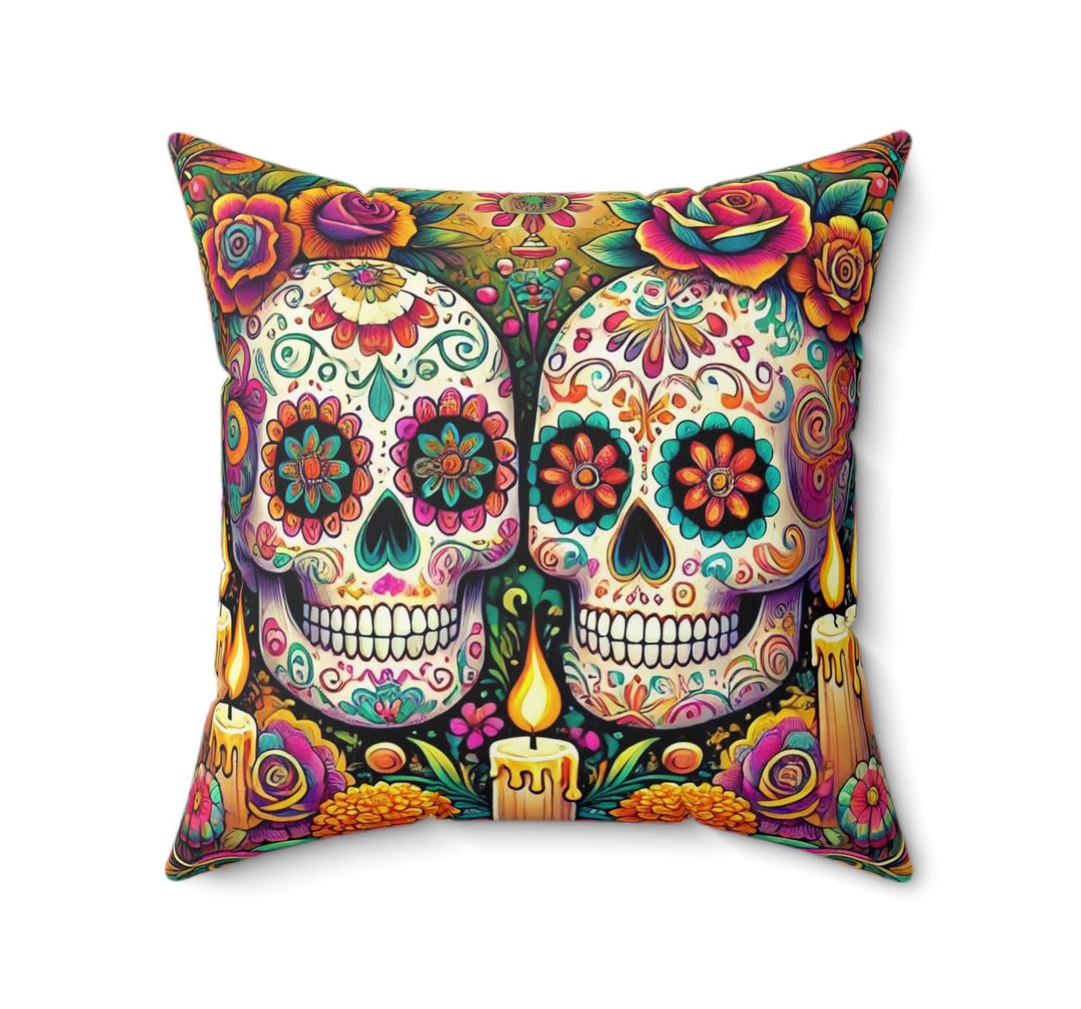 This Day of the Dead themed square pillow featuring sugar skulls is perfect for adding a festive touch to your home decor during the Dia de los Muertos celebration. The vibrant design gives a lively and cultural vibe, making it a great gift for those who appreciate this Mexican tradition.