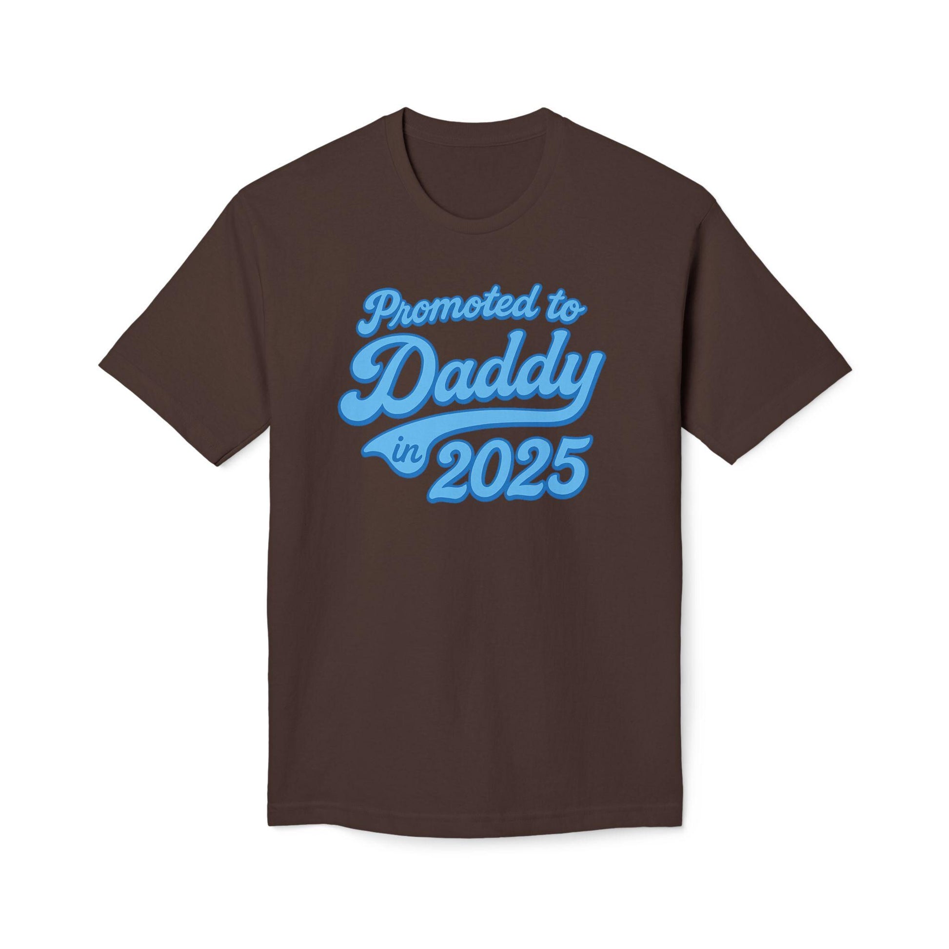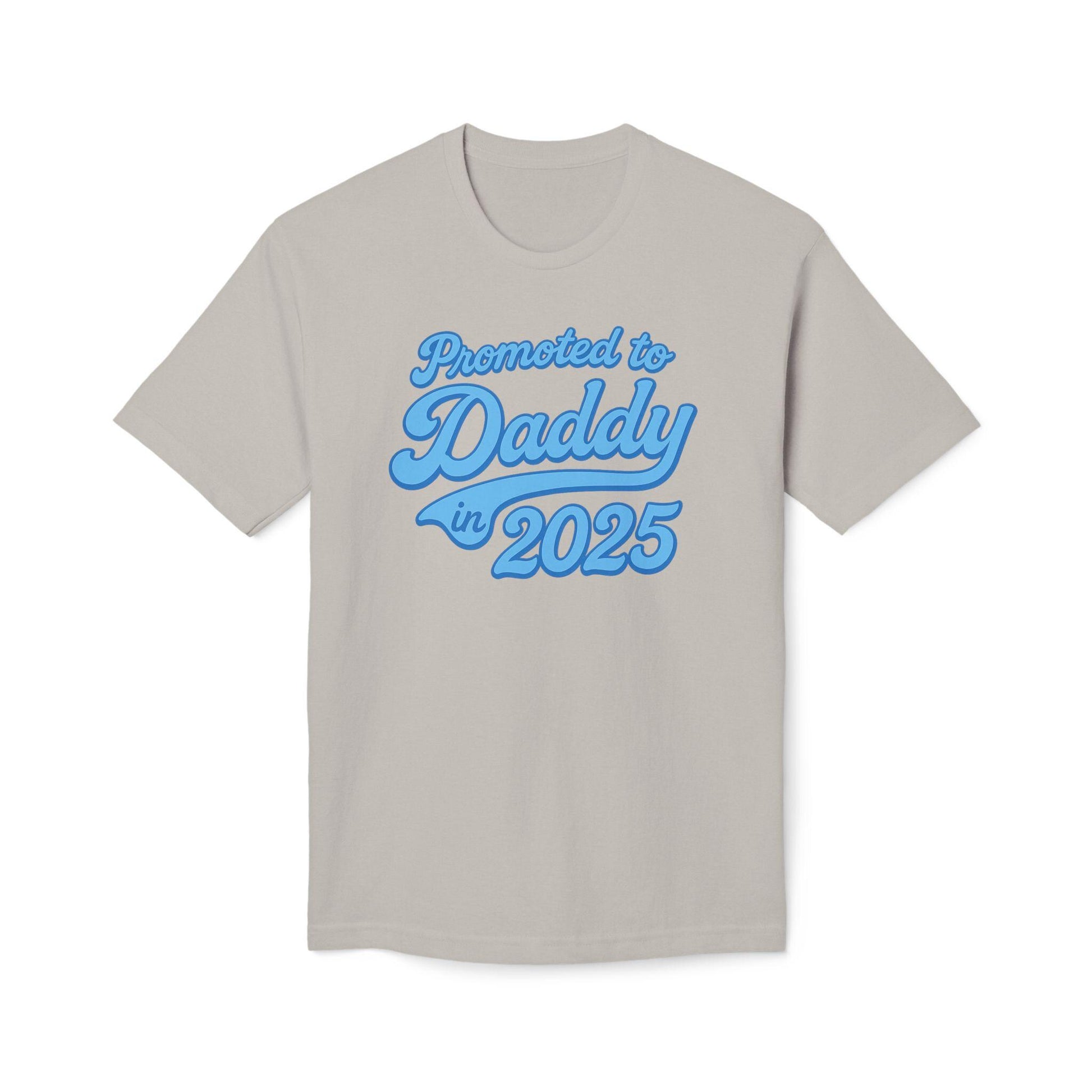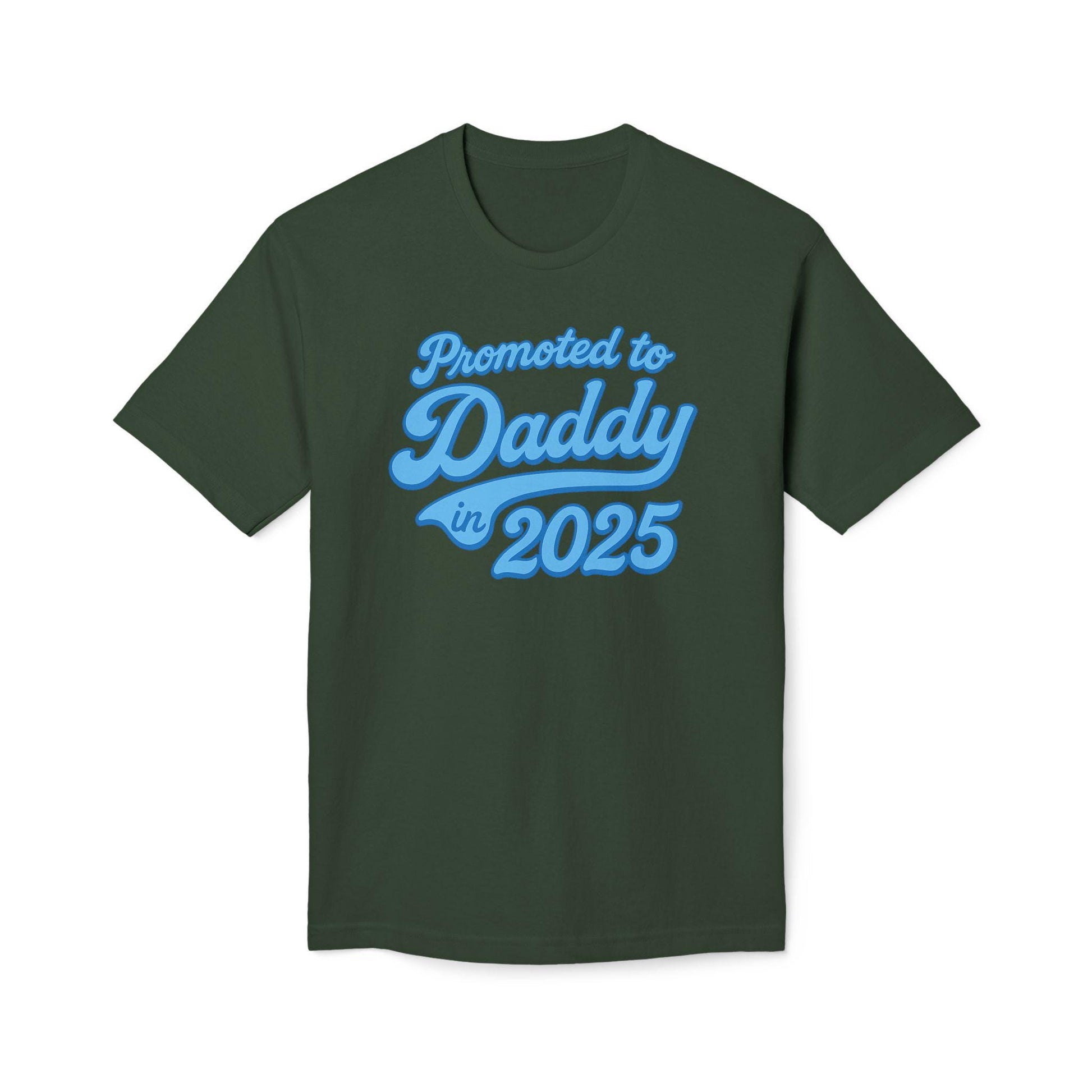 Customizable year 'Promoted to Daddy 2025' T-Shirt, perfect for new dads to announce their baby, giving a joyful and heartwarming vibe. Ideal for Father's Day, baby showers, and new parent celebrations.