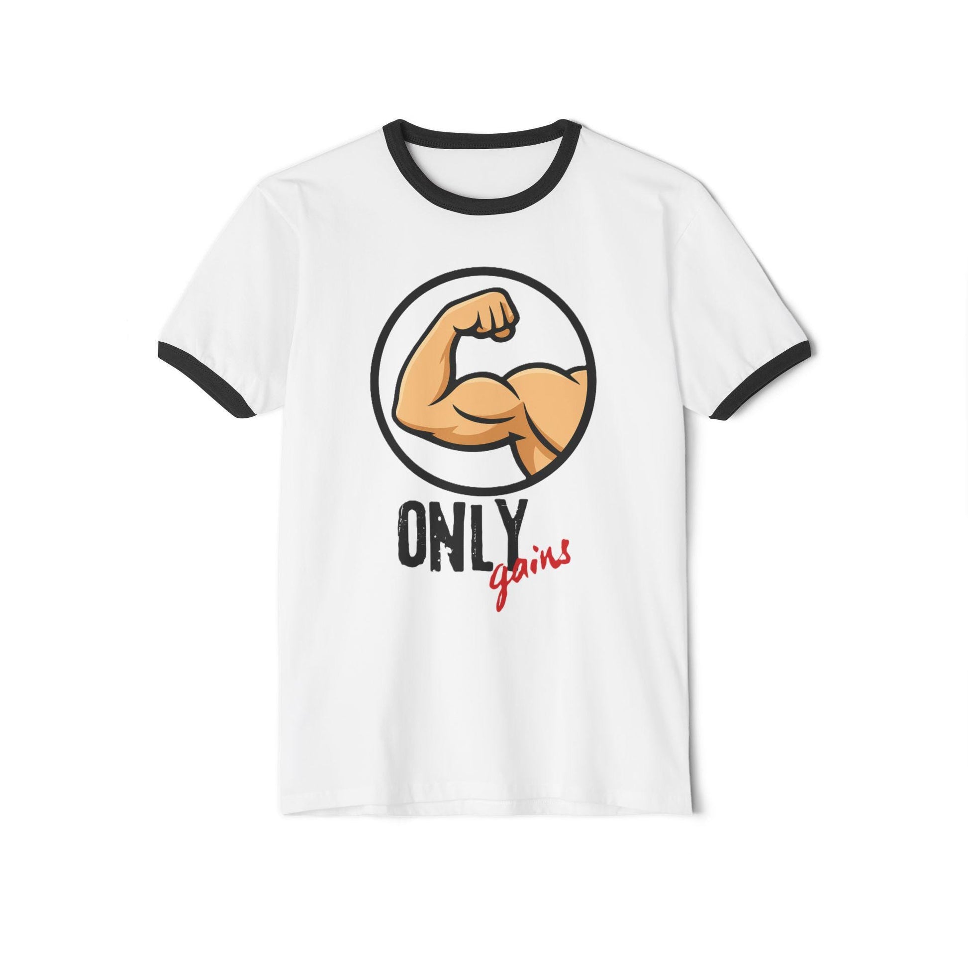 Stay motivated at the gym with this Only Gains muscle ringer t-shirt. Perfect for fitness enthusiasts and gym lovers, this casual tee is great as workout gear or everyday athletic wear. The design exudes a sense of determination and drive, making it a great gift for those striving for physical fitness goals. Ideal for holidays, birthdays, or any occasion to show support for someone's fitness journey.