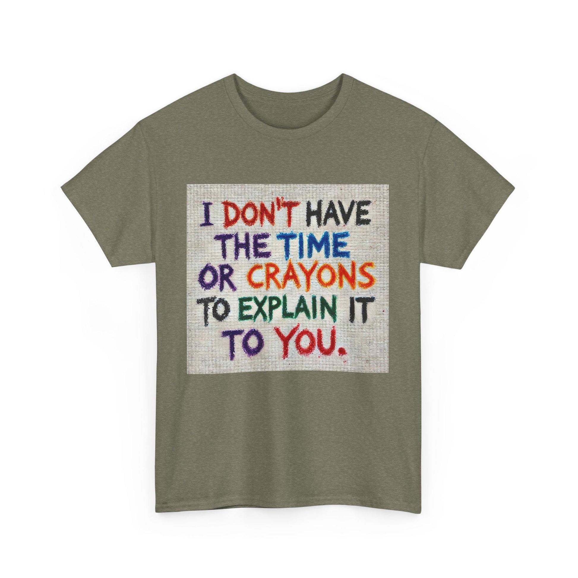 This original 'I DON'T HAVE THE TIME OR CRAYONS TO EXPLAIN IT TO YOU' design on a unisex heavy cotton T-shirt, perfect for lovers of saracasm and humor. This shirt offers a comfortable, relaxed fit and a timeless crew neckline suitable for any occasion. Made with sustainable 100% cotton fabric for year-round comfort.