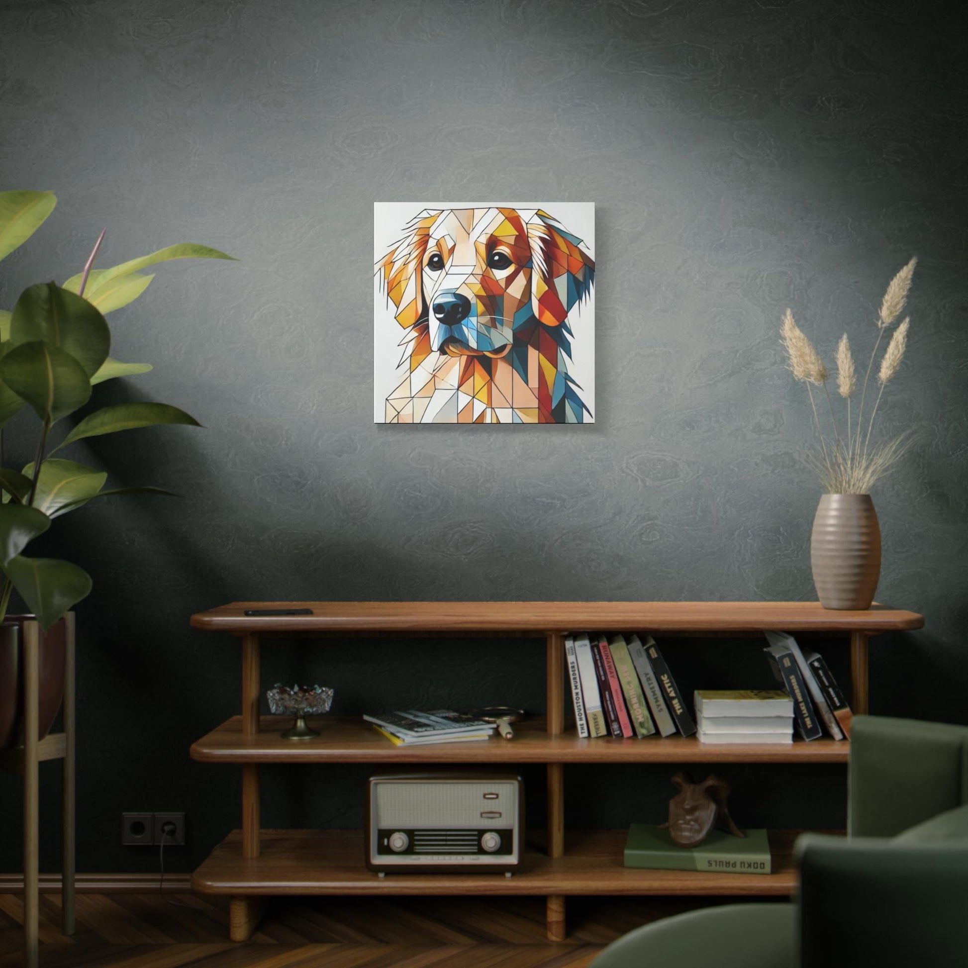 Modern Golden Retriever cubist design on matte canvas, perfect for all dog lovers and those seeking chic, modern decor. Ideal for a unique housewarming or birthday gift, this canvas exudes puppy charm. Fits well in living rooms, bedrooms, and offices, adding a touch of cool to any space.