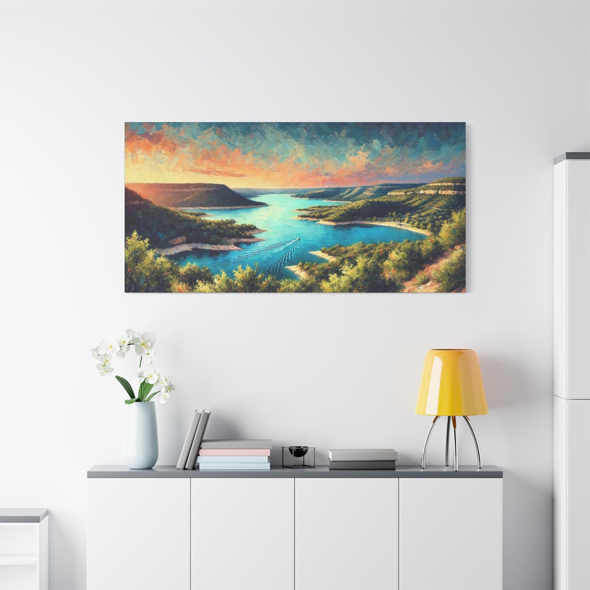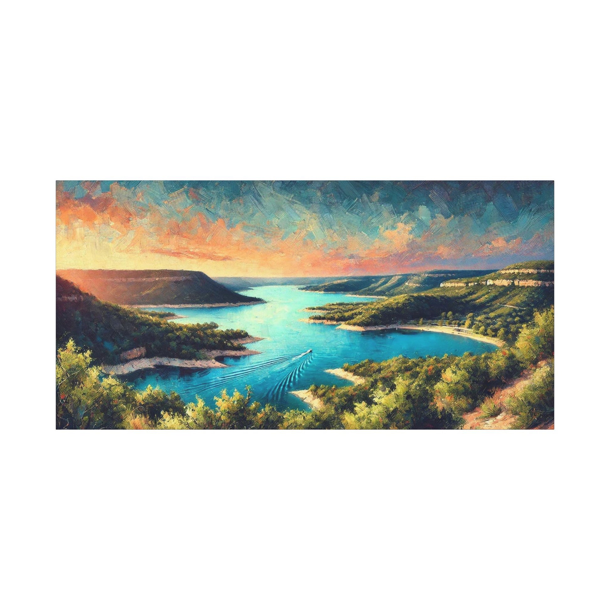 Experience the rugged and picturesque vibes of the Texas Hill Country with this original, high-quality Lake Travis art print on stretched matte canvas with a depth of 1.25". Available in 7 sizes, this canvas is perfect for art enthusiasts looking to bring a touch of nature into their homes. Ideal for nature lovers, home decorators, and those celebrating Texas themes or natural cowboy landscapes.