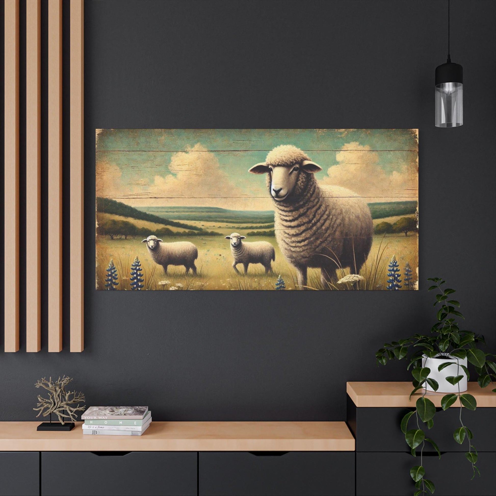 Experience the rugged and picturesque vibes of the Texas Hill Country with this original, high-quality sheep art print on stretched matte canvas with a depth of 1.25". Available in 7 sizes, this canvas is perfect for art enthusiasts looking to bring a touch of nature into their homes. Ideal for nature lovers, home decorators, and those celebrating country themes or cowboy landscapes.