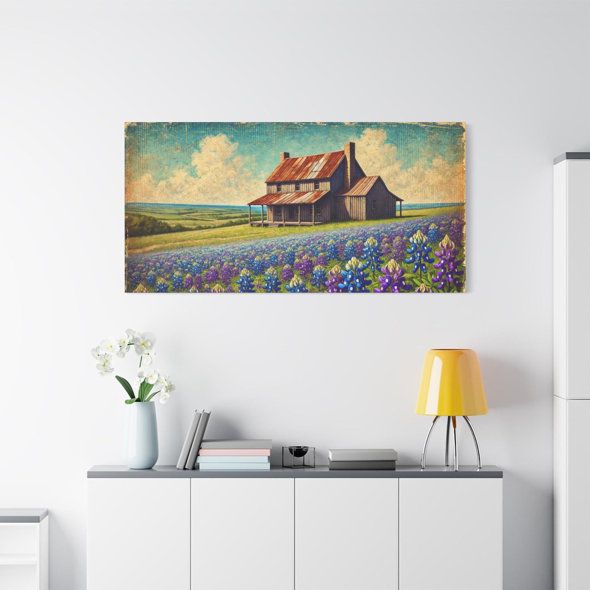 Experience the rugged and picturesque vibes of the Texas Hill Country with this original, high-quality brown farm houe and bluebonnets art print on stretched matte canvas with a depth of 1.25". Available in 7 sizes, this canvas is perfect for art enthusiasts looking to bring a touch of nature into their homes. Ideal for nature lovers, home decorators, and those celebrating country themes or cowboy landscapes.