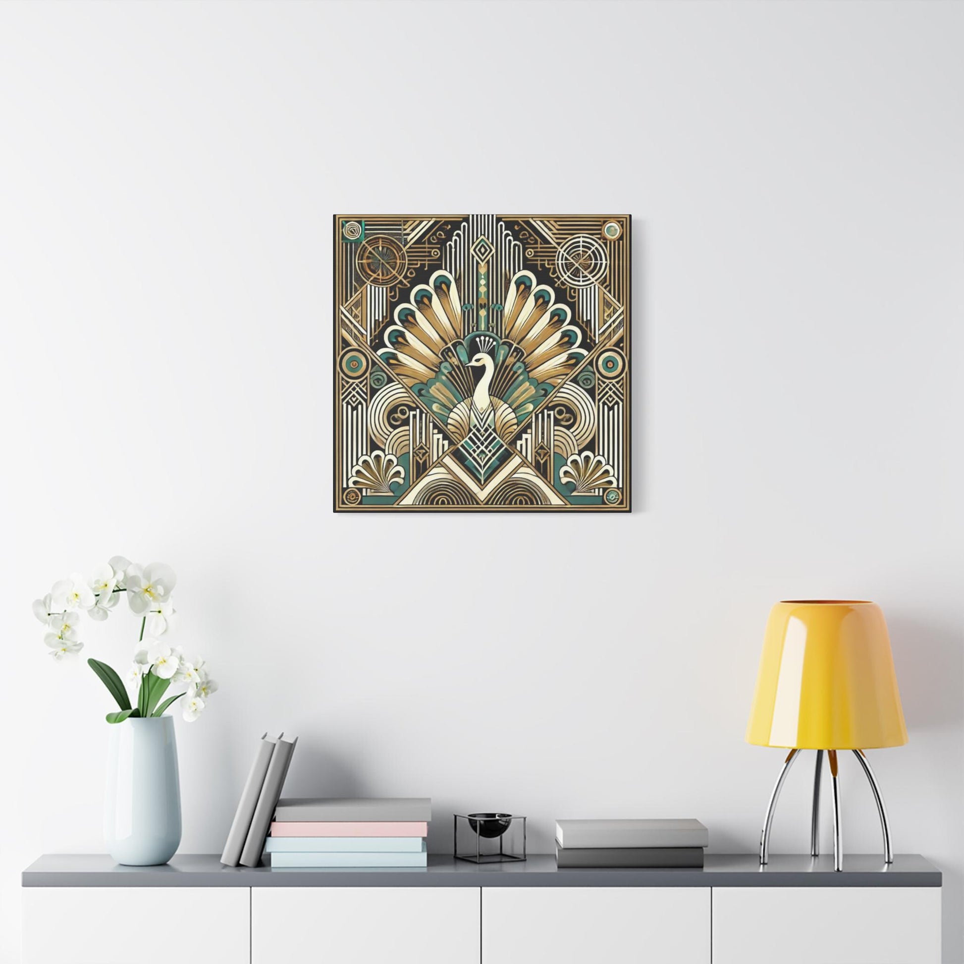 Elegant Peacock Art Deco design on a matte canvas, stretched and 1.25 inches thick. Perfect for art enthusiasts looking to add a touch of sophistication to their living space. Ideal for home decor, office decor, or as a thoughtful gift for birthdays, housewarmings, or holidays like Mother's Day.