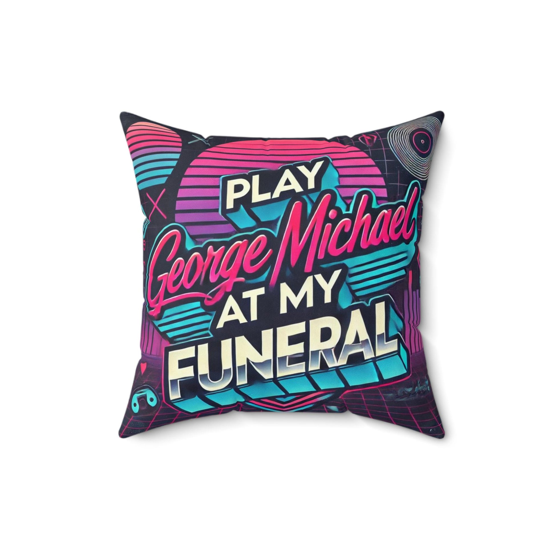 Add a touch of 80s retro charm to your home with this colorful Play George Michael At My Funeral square pillow. Perfect for decorating living rooms, bedrooms, and reading nooks, this soft throw pillow makes a great housewarming gift.