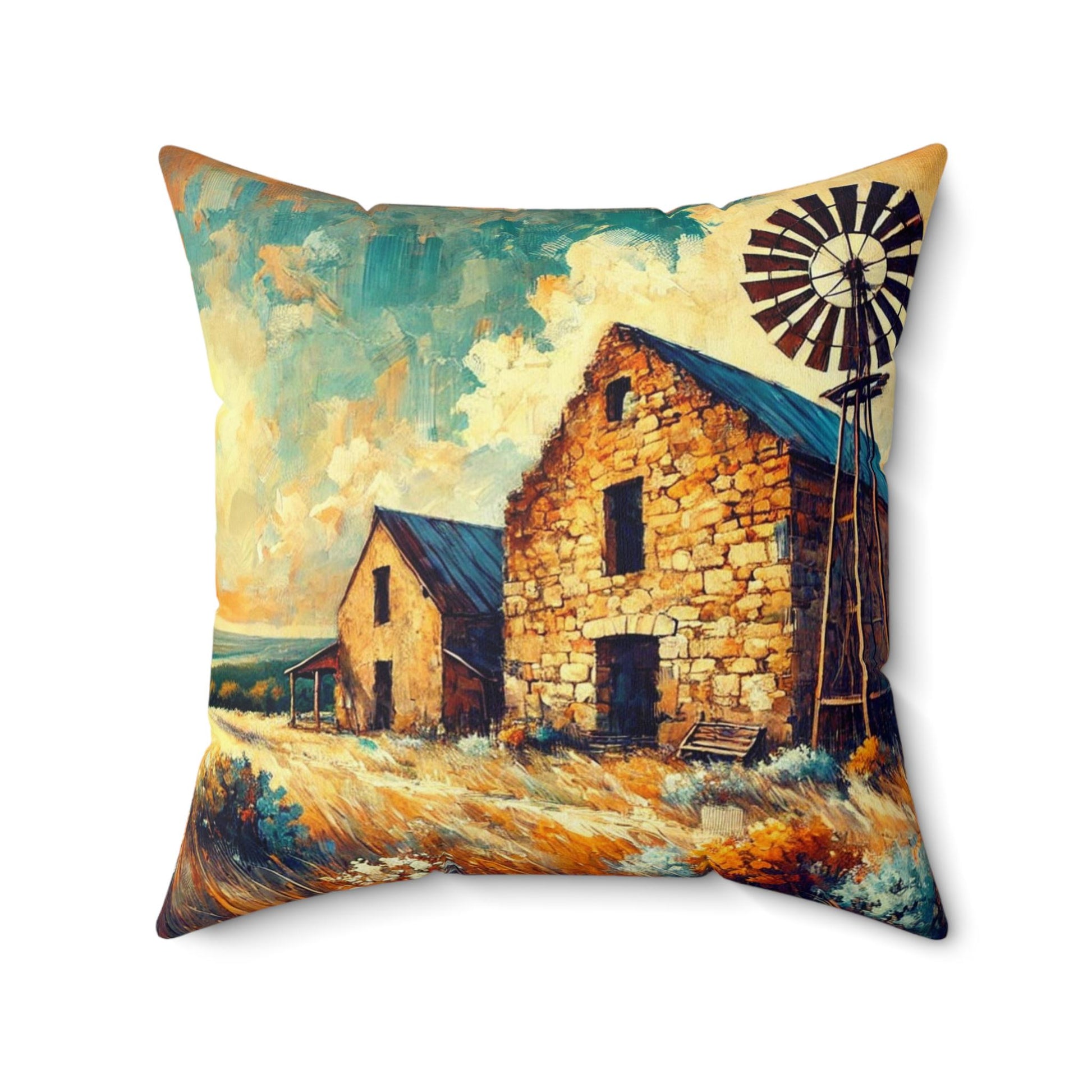 Add a touch of modern impressionist Texas Hill Country charm to your home with this stone building and windmill landscape square pillow. Perfect for decorating living rooms, bedrooms, and reading nooks, this soft throw pillow makes a great housewarming gift.