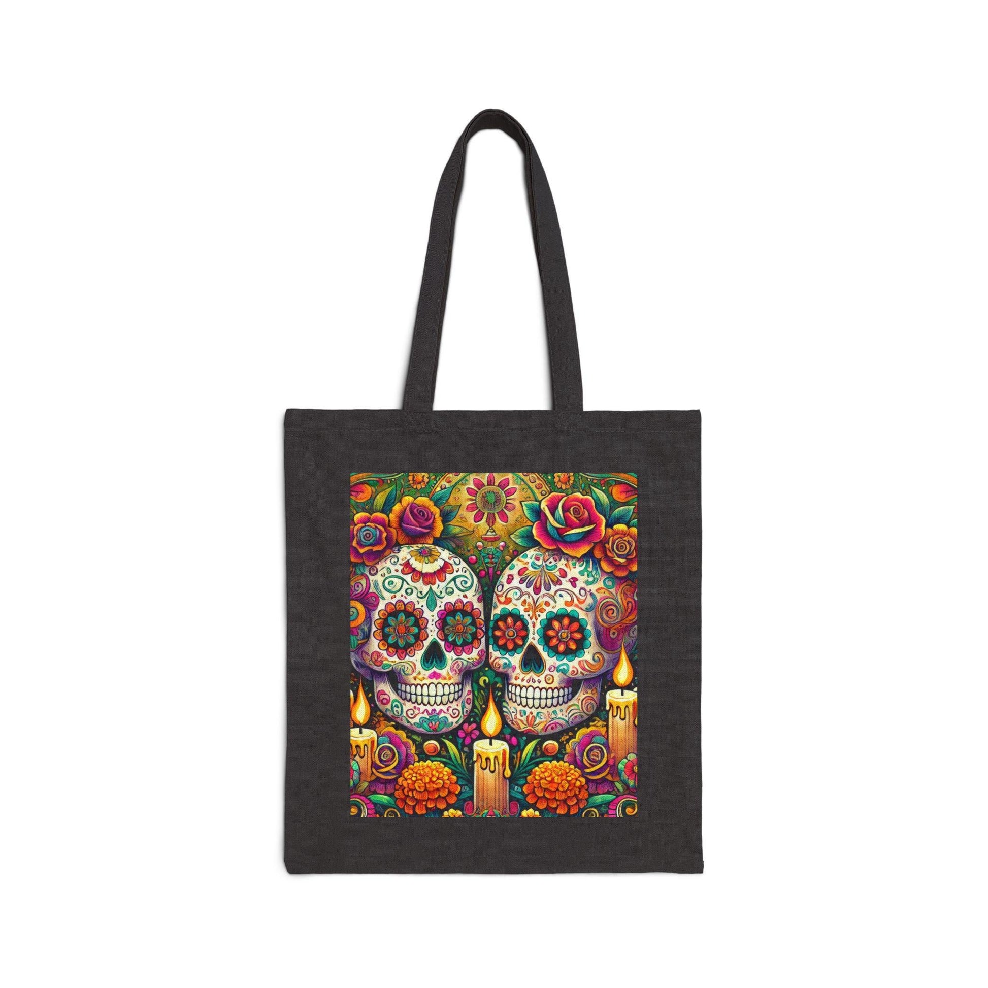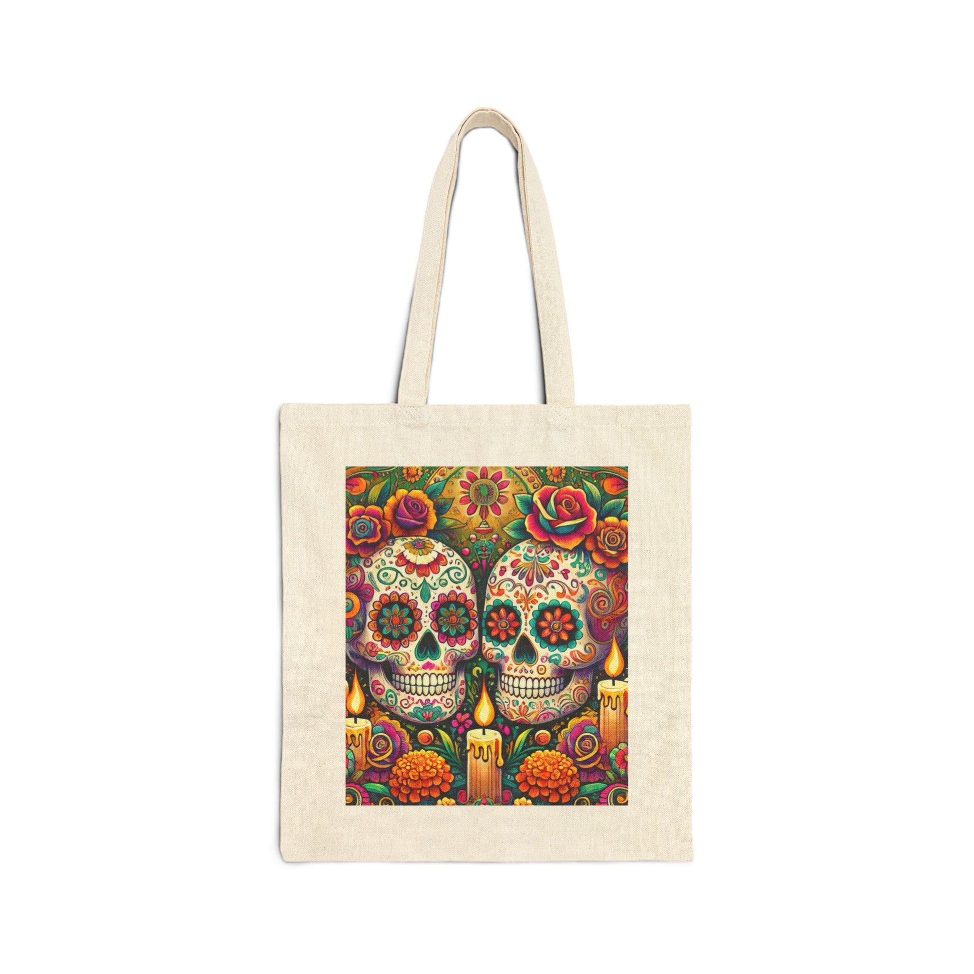 Sugar Skulls Cotton Canvas Tote Bag, Day of the Dead, Durable Market Bag, Boho Shopping Tote, Reusable Grocery Bag, Eco-Friendly Bag
